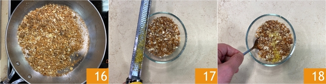 Lorsqu'elles sont dorées et croustillantes 16, aromatisez avec le zeste râpé du citron 17 et mélangez 18. Mettez de côté.