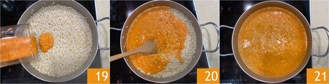Après 10 minutes de cuisson du riz, ajoutez la crème de poivrons 19 et mélangez bien 20. Continuez la cuisson du riz pendant encore 4 minutes 21, puis éteignez le feu.
