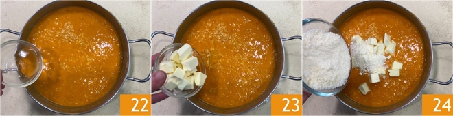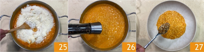 Hors du feu, liez le risotto avec le vinaigre 22, le beurre froid en dés 23 et le Parmigiano Reggiano DOP râpé 24.