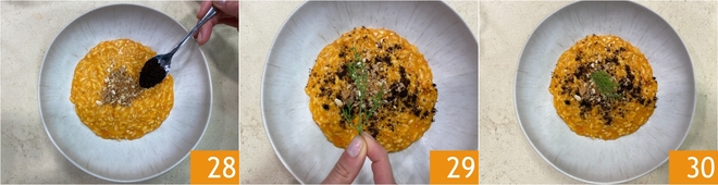 Enfin, garnissez avec de la poudre de citron brûlé 28, encore un peu de zeste de citron râpé et un brin d'aneth 29. Votre risotto aux poivrons doux et crumble d'anchois est prêt à être servi 30!