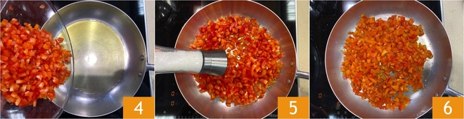 Versez les poivrons dans une poêle avec un filet d'huile chaude 4, salez 5, poivrez et faites cuire à feu doux pendant environ 30 minutes 6.