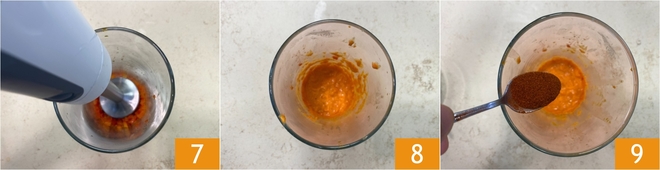 Transférez les poivrons cuits dans un récipient et mixez avec un mixeur plongeant 7. Lorsque vous obtenez une crème lisse et homogène 8, aromatisez à votre convenance avec le paprika fumé 9 et mélangez. Mettez de côté.