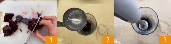 Pour préparer le risotto crémeux à la caponata sicilienne, coupez la betterave précuite en morceaux 1, mettez-la dans un pichet, ajoutez une louche d'eau 2 et mixez le tout avec un mixeur plongeant 3.