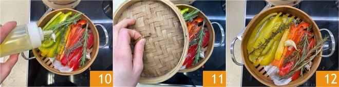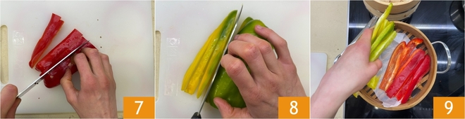 Coupez-les en lanières 7 et procédez de la même façon avec les poivrons jaunes 8. Placez un panier vapeur en bambou sur le feu, déposez une feuille de papier sulfurisé et disposez-y les poivrons 9.