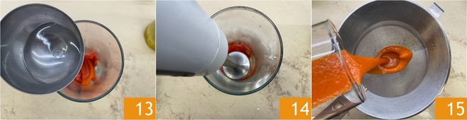 Transférez les poivrons rouges dans le pichet avec une louche d'eau de cuisson 13 et un filet d'huile, mixez-les 14 et filtrez-les à travers une passoire 15.