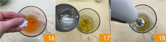 Assaisonnez la sauce obtenue avec une pincée de sel 16. Procédez de la même façon avec les poivrons jaunes : mettez-les dans un pichet avec une louche d'eau 17 et mixez-les 18.