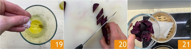 Filtrez et salez la sauce jaune 19. Occupez-vous maintenant des carottes violettes : épluchez-les et coupez-les en morceaux 20. Procédez à la cuisson à la vapeur 21.