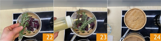 Assaisonnez également avec du romarin 22, du thym, de l'ail et un filet d'huile 23. Couvrez et faites cuire pendant 30 minutes 24.