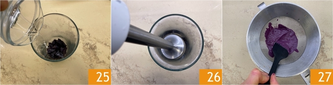 Une fois cuites, transférez les carottes dans le pichet avec la louche d'eau habituelle 25, mixez 26 et filtrez 27.