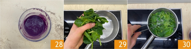 Salez votre sauce violette 28. Passez maintenant à la dernière sauce : faites blanchir les épinards dans de l'eau bouillante 29 jusqu'à ce qu'ils soient tendres 30.