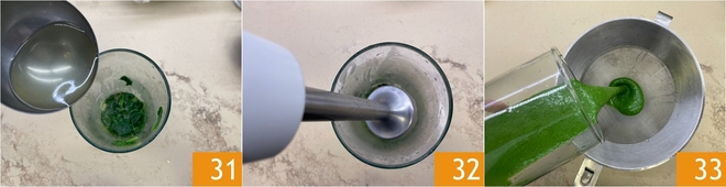 Transférez les épinards cuits dans le pichet avec une louche d'eau 31, mixez avec le mixeur plongeant 32 et filtrez à travers la passoire 33. Salez et réservez la sauce verte.