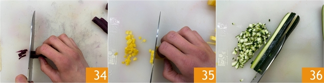 Occupez-vous maintenant des légumes crus qui serviront de base au risotto : parez et coupez en tout petits dés les carottes violettes 34, les carottes jaunes 35 et la partie verte des courgettes 36.