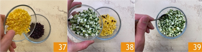 Dans un bol, versez les dés de carottes 37 et de courgettes 38, mélangez 39 et réservez.