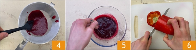 Filtrez la sauce obtenue à travers une passoire 4, salez, mélangez et réservez la première sauce 5. Nettoyez les poivrons rouges en enlevant le pédoncule 6 et en retirant les filaments et les graines à l'intérieur.