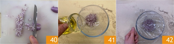 Préparez l'échalote : pelez-la et coupez-la en petits dés sans l'écraser 40, sinon elle deviendrait amère. Placez-la dans un bol avec l'huile 41, couvrez avec un film alimentaire adapté à la cuisson au micro-ondes 42 et faites cuire au micro-ondes pendant 10 secondes à pleine puissance (env. 750 W). Sortez le bol et remuez l'échalote, puis répétez la même opération 3 fois. De cette façon, la note acide sera atténuée et seule la douceur de l'échalote sera mise en valeur.