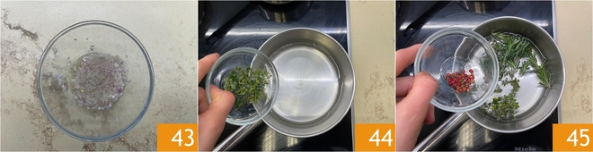 Réservez l'échalote 43 et préparez l'infusion qui servira à cuire le risotto. Dans une petite casserole, versez l'eau, le romarin, la pipernia 44 et le poivre rose en grains 45.