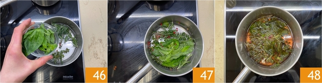 Ajoutez le basilic 46 et chauffez l'eau sans dépasser 80° 47. Laissez infuser pendant une heure 48.