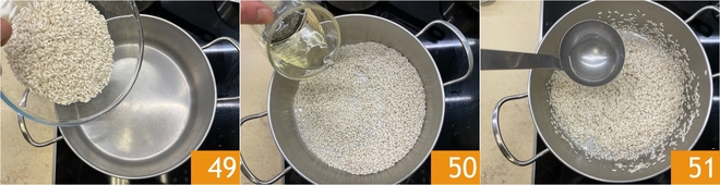 Cuisez le riz : dans une casserole, versez le riz et faites-le revenir à sec pour le toaster 49, déglacez avec le vin blanc 50, laissez évaporer, puis commencez la cuisson en ajoutant un ou deux louches d'eau chaude 51, salez et faites cuire pendant 5-6 minutes.