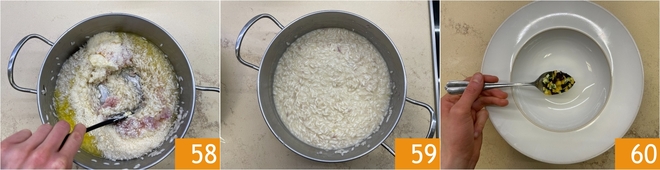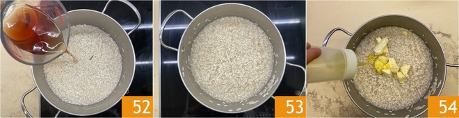 Poursuivez la cuisson en ajoutant petit à petit l'infusion pour les 5-6 minutes restantes 52, les temps de cuisson dépendant de la qualité du riz. Une fois le riz cuit 53, liez-le avec du beurre froid et de l'huile 54.