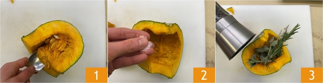 Pour préparer le risotto à la courge, commencez par couper la courge en deux : prélevez une tranche de 100 g et mettez-la de côté, puis retirez la chair et les graines du reste 1. Assaisonnez avec du sel 2, du poivre, du romarin et de la sauge 3.