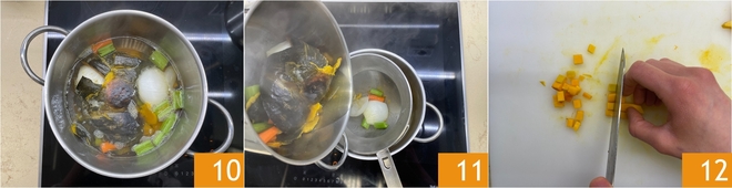Une fois prêt 10, filtrez le bouillon en le versant dans une petite casserole 11. Coupez maintenant la tranche de courge en petits dés d'environ un demi-centimètre 12.