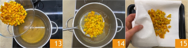 Blanchissez brièvement les dés dans le bouillon chaud, pendant environ 25 secondes 13. Égouttez 14 et séchez délicatement 15.
