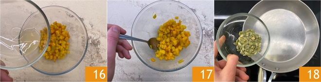 Assaisonnez la courge avec le vinaigre de cidre 16 et mélangez pour parfumer 17. Faites griller les graines de courge à la poêle à feu moyen-doux pendant 7-8 minutes ou au four à 170 C pendant environ 5 minutes, jusqu'à ce qu'elles soient croustillantes.