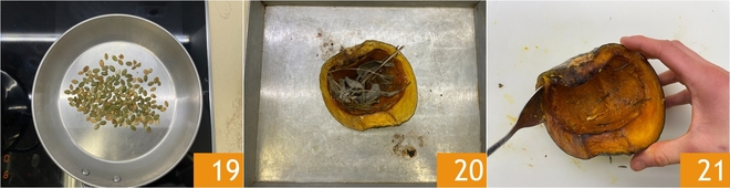 Réservez 19. Occupez-vous de la courge cuite au four 20 : prélevez la chair à l'aide d'une cuillère 21, mettez-la dans un bol et écrasez-la à la fourchette jusqu'à obtenir une purée rustique.