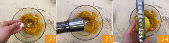 Rectifiez l'assaisonnement en sel 22 et en poivre 23 et parfumez avec le zeste de citron râpé 24.