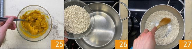 Mélangez et réservez 25. Faites dorer le riz à sec dans une casserole à fond épais 26 27.