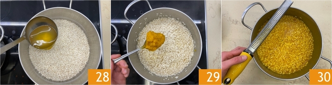 Commencez la cuisson en ajoutant le bouillon de légumes chaud peu à peu 28. Après 5-6 minutes, incorporez la purée de courge 29 et poursuivez la cuisson en remuant, jusqu'à ce que le risotto soit à point. Retirez du feu et parfumez encore avec du zeste de citron 30.