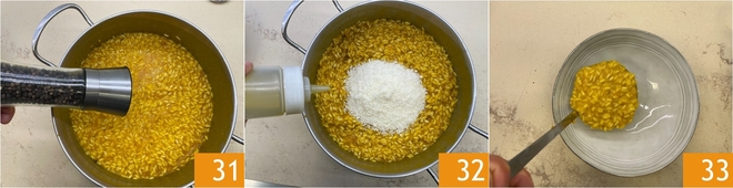 Poivrez selon votre goût 31 et montez le risotto avec le fromage râpé, le vinaigre et l'huile d'olive extra vierge 32, en mélangeant pour obtenir une texture crémeuse. Répartissez le risotto dans les assiettes 33.
