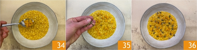 Terminez avec les dés de courge au vinaigre 34 et les graines de courge grillées 35. Votre risotto à la courge et aux graines est prêt à être servi 36 !