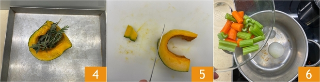 Déposez la courge sur une plaque de cuisson 4 et enfournez à 140 C pendant environ 2 heures, jusqu'à ce qu'elle soit très tendre. Entre-temps, épluchez la tranche de courge de 100 g que vous avez conservée 5 ; ne jetez pas la peau, elle servira pour le bouillon. Dans une casserole, faites griller l'oignon coupé en deux à sec, puis ajoutez les carottes et le céleri coupés en gros morceaux 6.