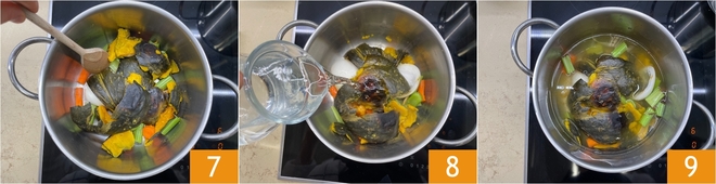 Ajoutez également la peau de la courge 7, puis couvrez avec 750 g d'eau 8 et faites cuire pendant 30 minutes 9.