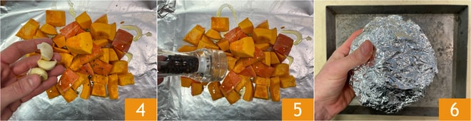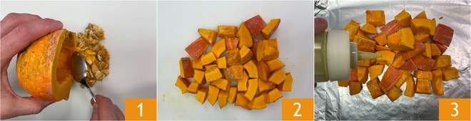 Pour préparer le risotto crémeux à la courge et quartirolo, commencez par laver la courge, puis éliminez les graines et les filaments internes 1 et coupez la chair en cubes, sans la peler 2. Transférez-les sur une feuille d'aluminium et assaisonnez avec de l'huile 3.