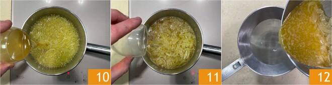 Quand le beurre devient ambré et que les oignons sont fanés, ajoutez le vin blanc 10 et le vinaigre 11. Laissez cuire quelques minutes, puis filtrez à travers une passoire 12 et mettez le tout au réfrigérateur pour le faire durcir.