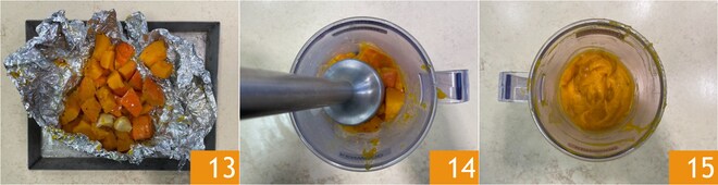 Quand la courge est prête 13, transférez-la dans un récipient, éliminez les gousses d'ail et mixez avec un mixeur plongeant 14 jusqu'à obtenir une purée douce et soyeuse 15.