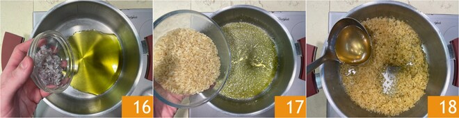 Dans une casserole, ajoutez l'huile et l'échalote finement hachée au couteau 16 et laissez dorer. Versez le riz dans la casserole 17 et faites-le griller pendant quelques minutes. Mouillez avec le bouillon de légumes 18. Faites cuire le riz en ajoutant une louche à chaque fois que le précédent est absorbé.