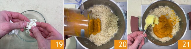 Entre-temps, émiettez grossièrement le quartirolo 19. Quand le riz est cuit, ajoutez la crème de courge 20 et le beurre acide froid 21.