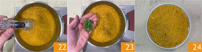 Ajoutez le poivre 22 et la marjolaine 23. Laissez reposer le risotto quelques minutes puis servez-le 24.