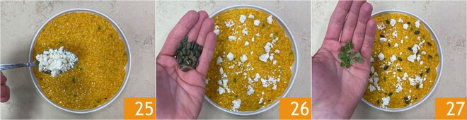 Ajoutez le quartirolo sur la surface du risotto 25. Garnissez avec les graines de courge grillées 26 et quelques feuilles de marjolaine 27. Votre risotto crémeux à la courge et quartirolo est prêt à être dégusté !