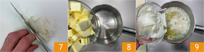 Pour réaliser le beurre acide, commencez par couper l'oignon en julienne 7. Faites fondre le beurre dans une petite casserole 8 et ajoutez l'oignon 9.