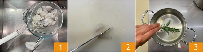 Pour préparer le risotto petits pois et seiches, nettoyez les seiches, séparez les tentacules de la tête 1, retirez la partie avec le bec et les yeux, coupez les têtes en deux pour une taille plus petite 2. Dans une poêle, versez un filet d'huile, une gousse d'ail écrasée, les brins de romarin et de sauge 3.