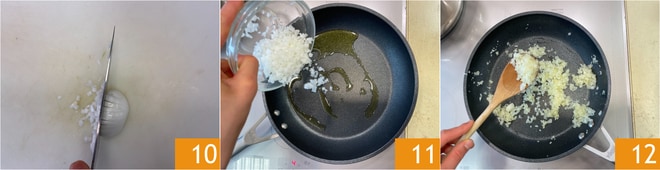 Émincez les deux oignons 10, faites-les revenir dans une poêle 11 avec un peu d'huile et de sel, retirez la moitié de l'oignon émincé 12.