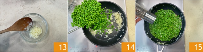 Réservez-le 13. Versez dans la poêle, avec l'oignon restant, les petits pois 14, salez et poivrez 15, faites sauter le tout ensemble pendant environ 5-8 minutes, afin de cuire les petits pois.