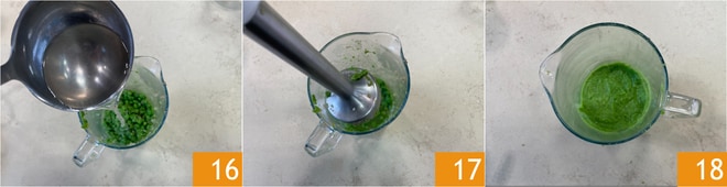 Mettez les petits pois dans un récipient 16, ajoutez une louche de bouillon chaud 17 et mixez avec le mixeur plongeant pour obtenir une crème 18
