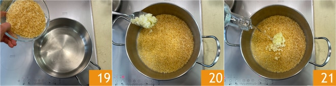 Versez le riz dans une casserole bien chaude 19, mélangez jusqu'à ce que le grain soit très chaud, ajoutez l'oignon revenu réservé précédemment 20, déglacez avec le reste du vin blanc 21