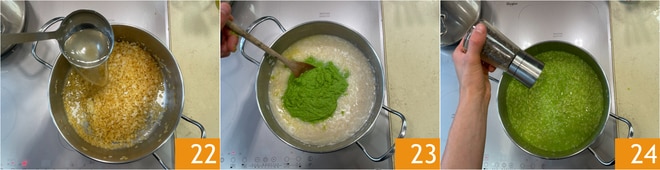 Ajoutez un peu de bouillon chaud à la fois 22, salez et portez à cuisson en ajoutant du bouillon au besoin. Quand la cuisson est presque terminée, incorporez la crème de petits pois 23, ajustez le poivre 24