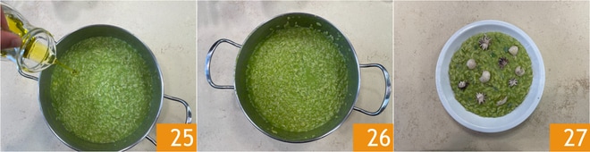Retirez du feu et liez le risotto avec de l'huile 25, et mélangez 26. Servez le risotto avec les seiches cuites à la poêle et servez immédiatement 27.